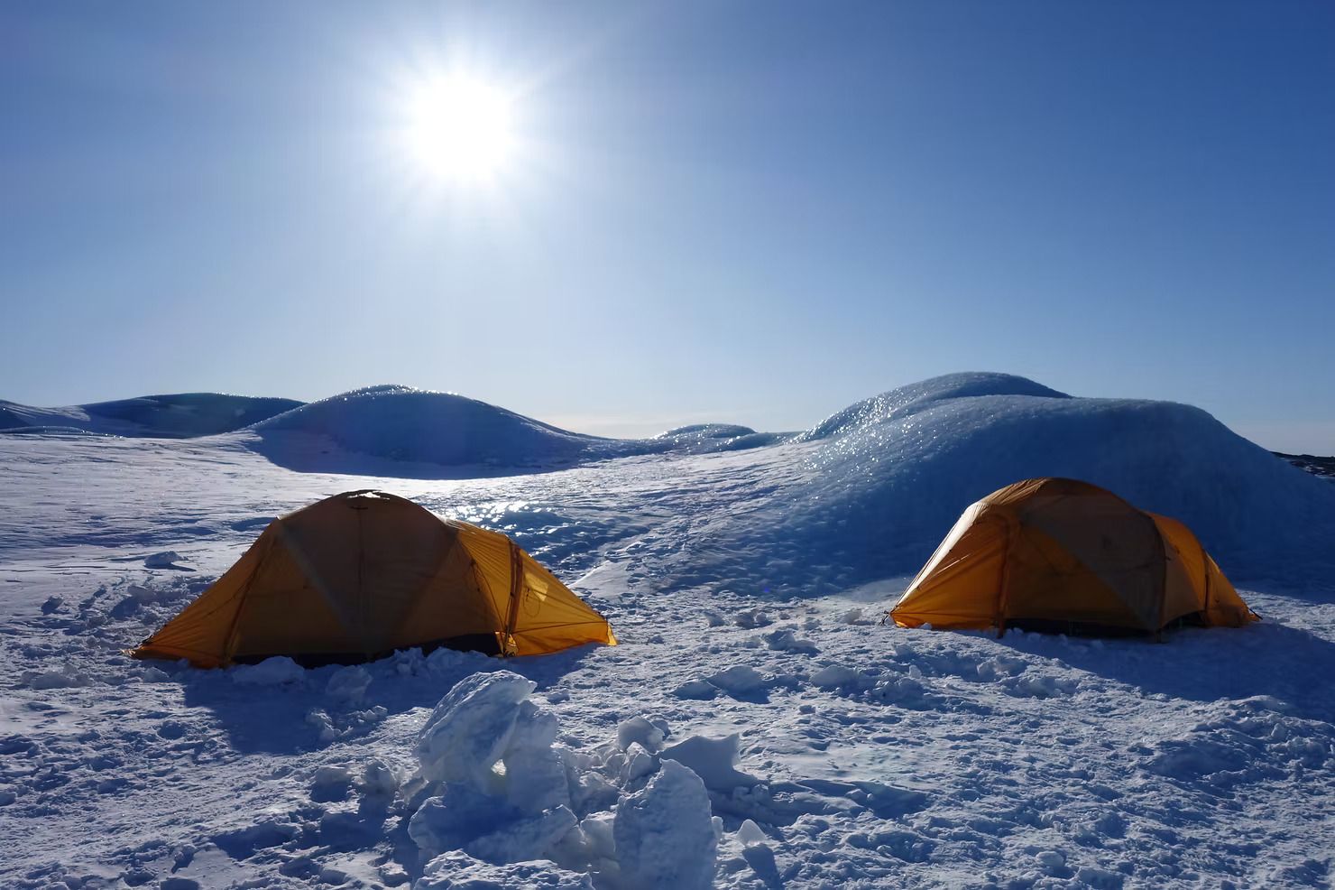 Powered up with biscuits, we set up our camp. Screwing our tent pegs in to the ice, my travel companion and I proudly erected our spacious tent for the night.